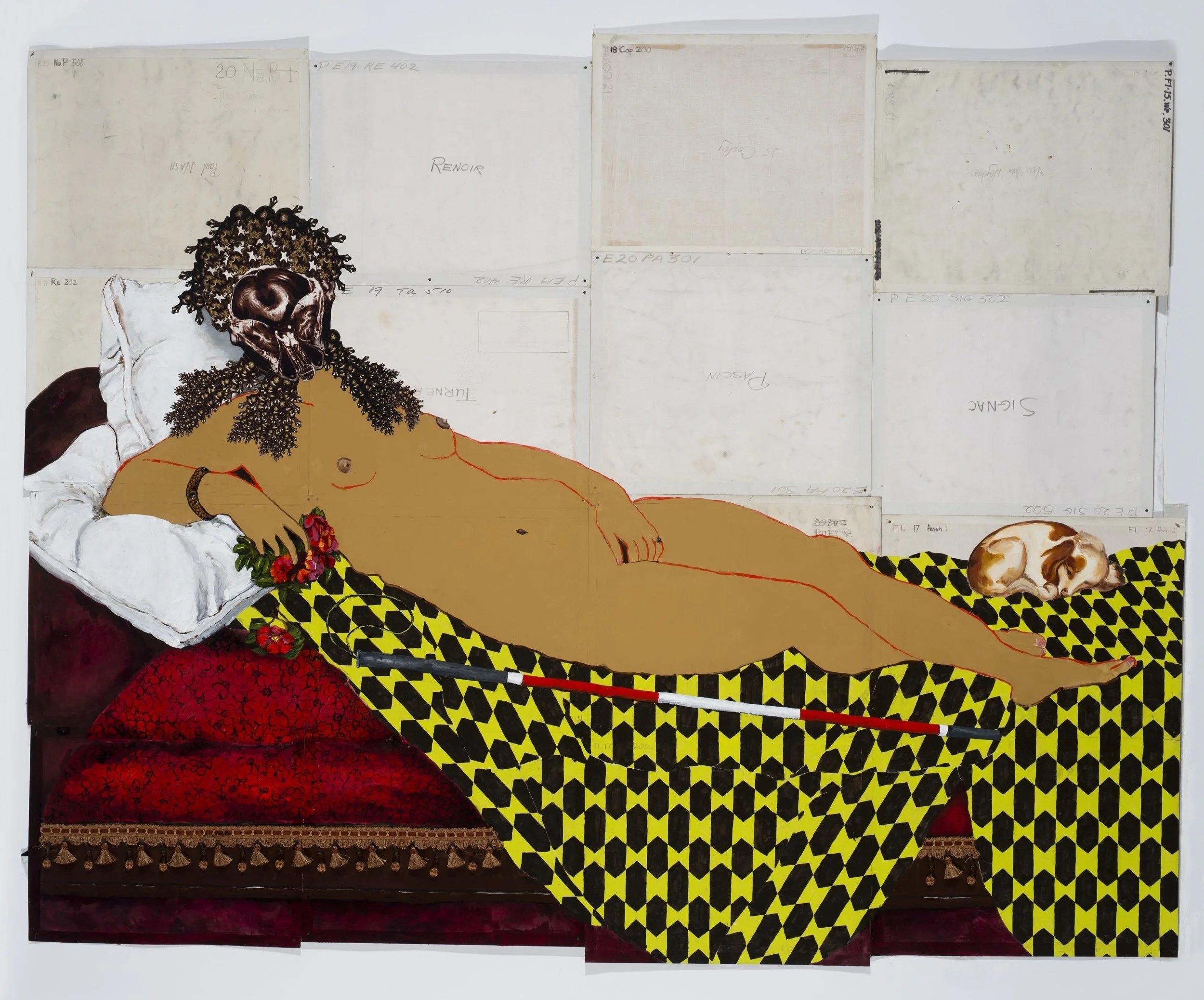 Katherine Sherwood, Blind Venus (for G.), 2018; mixed media on found linen, 90 x 114 inches. Courtesy of the artist.